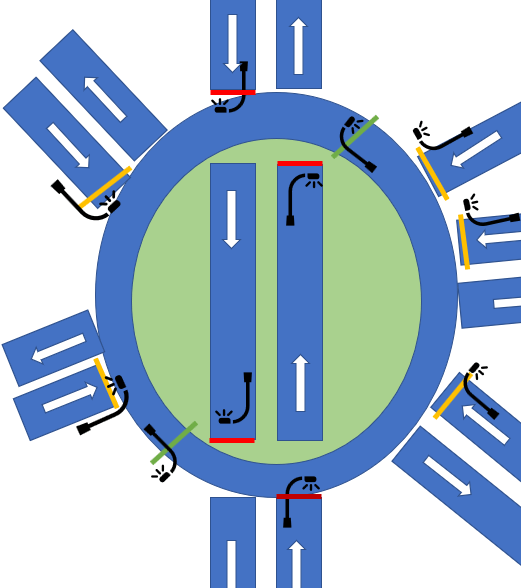 Quando scatta il rosso, le altre entrate affrontano la rotatoria normalmente (ossia dando precedenza a sinistra), senza avere il mostruoso volume di traffico in arrivo dall’asse principale.